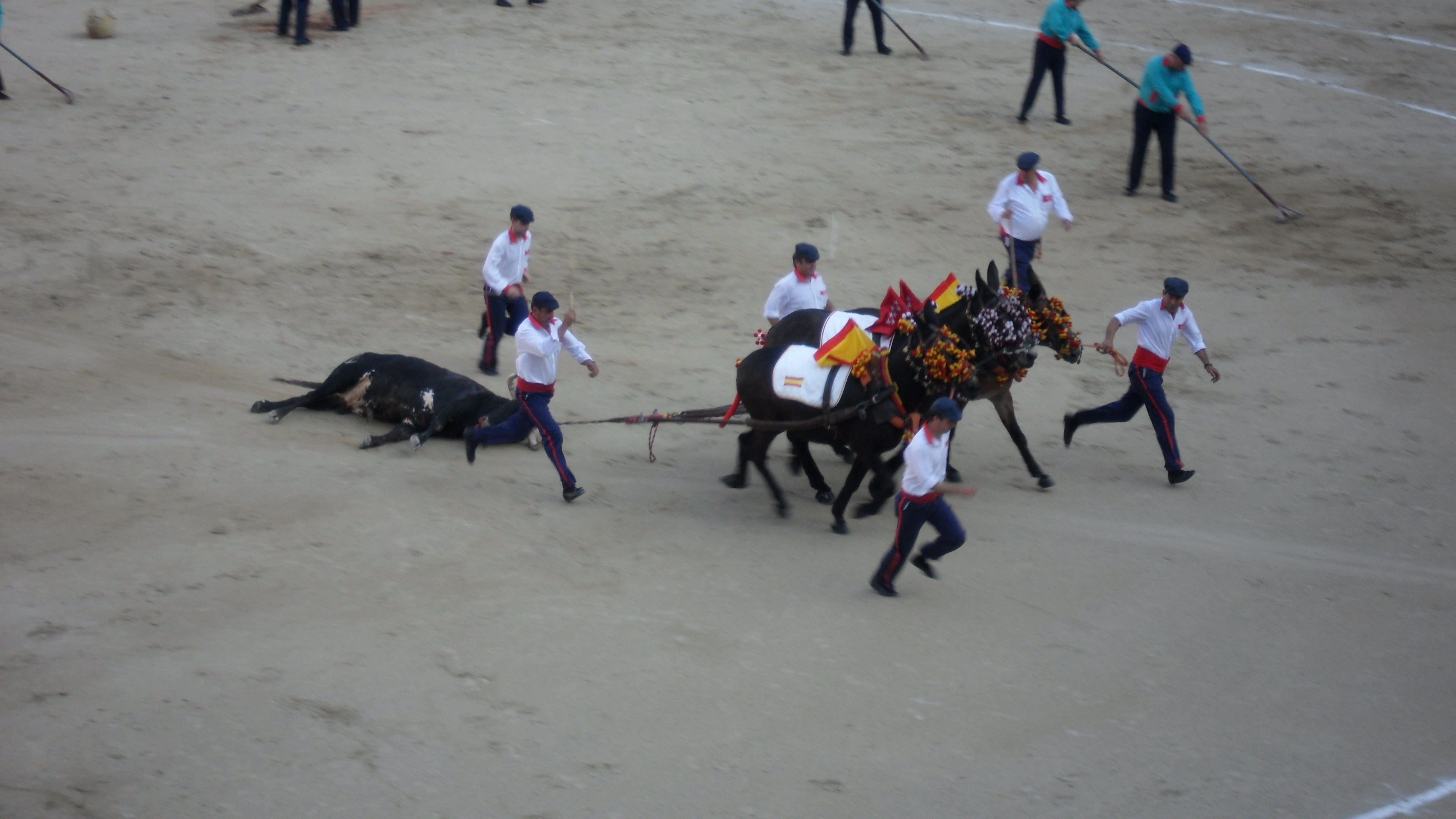 It seems the main goal of the matador is to get the bull to continually dance around him as close as possible using the red cape as an irritant. A particularly expressive display is greeted with cheering, clapping and “ole’s” from the crowd. Once the bull was tired, the matador produced a sword which was then raised and driven into the back of the neck of the charging bull with the aim of killing it in one strike. Failure to kill the bull with the first strike meant that the bull was danced around some more before a final stab to the back of the head. The dead bull is then tied to the back of three horses, dragged around the ring as the crowd jeers, then is dragged out (and probably off to the butcher). Men then pour out into the ring, sweep and rake over the blood then the whole thing is repeated again.