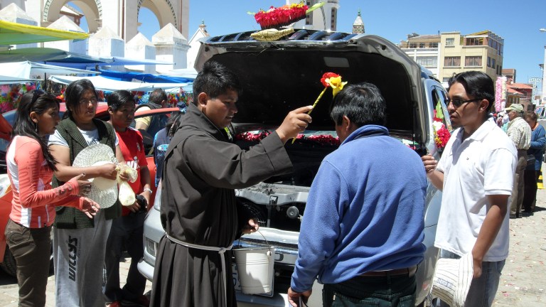 Apart from the lack of appreciation Bolivians have for quality dancing, the other thing we have been dealing with is Bolivian roads and their driving. When Bolivians get a new car they have this wonderful notion of a spiritual day when the car is decorated in flowers, driven to a religious town 3hrs away and blessed by a local priest so as to ensure safety. But in reality, this spiritual day is little more than an excuse for the locals to get hammered. We saw this first hand as the spiritual car blessing day co-incided with our trip to Lake Titicaca. Going through the town in the morning, the scene was beautiful; cars buried under elaborate flower displays, priests in robes splashing water about and well dressed families milling around enjoying the weather and the markets. Coming back through the town that afternoon was instead like wandering through a Minto Hotel carpark that had just held a Christmas party for recovering drug addicts and day release prisoners. The men looked disheveled and were only kept upright by poorly constructed alley walls. The ladies now used their beautiful, colourful dresses as impromptu screens for public urination. It was the closest thing you’ll see to a Bolivian day at the horse races. Then due to a mix of perceived divine vehicle protection, and a legal system not quite up to framing legislation around drink driving, they all get in their cars and drive home…….