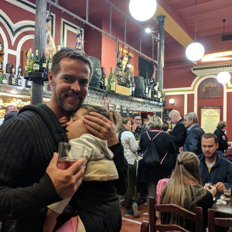 Then after a nap it’s out again in the evening for dinner and drinks. The kids have pretty much settled into the Spanish timezone allowing mummy and daddy plenty of vino time. But although the kids are staying up until 930pm, it still isn’t enough to be truly Spanish. So the local bar that we drop into every night on the way home for a finishing vino and sangria always sees two excited parents with two unconscious children – one in the pram and one strapped to my chest. They probably think we actually don’t have children, but instead are carting around two life size tamagotchis as a school project and aren’t taking the exercise overly seriously. I mean what ‘parent’ would take their tamagotchi to a bar and drink till 11pm with it strapped to their chest? That would be worth a mark of F. Thankfully they are real children and not a project?