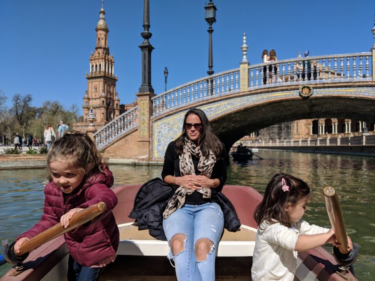 And that has been the rhythm of Seville. Our holiday is finally truly underway. In the morning (well Spanish morning which is from 10am at the earliest) we see some sights, then settle in for a long lunch as the kids have a nap. We’ve seen the Cathedral (well briefly – the girls were pretending they were puppies and chasing each other around then Olivia tried to climb onto a silver statue), taken a horse and carriage ride around the city (now the girls argue about who owns every horse they see. They’ve settled on the white ones being Millie’s and the brown ones belong to Liv), wandered around Plaza De Espana (including a rowboat around the lake where the girls demanded they paddle until they hit a wall) and spent a morning in the Alcazar Palace (where despite standing in front of one of the most beautiful pieces of architecture in the world all the girls cared about were the fish in the pond).
