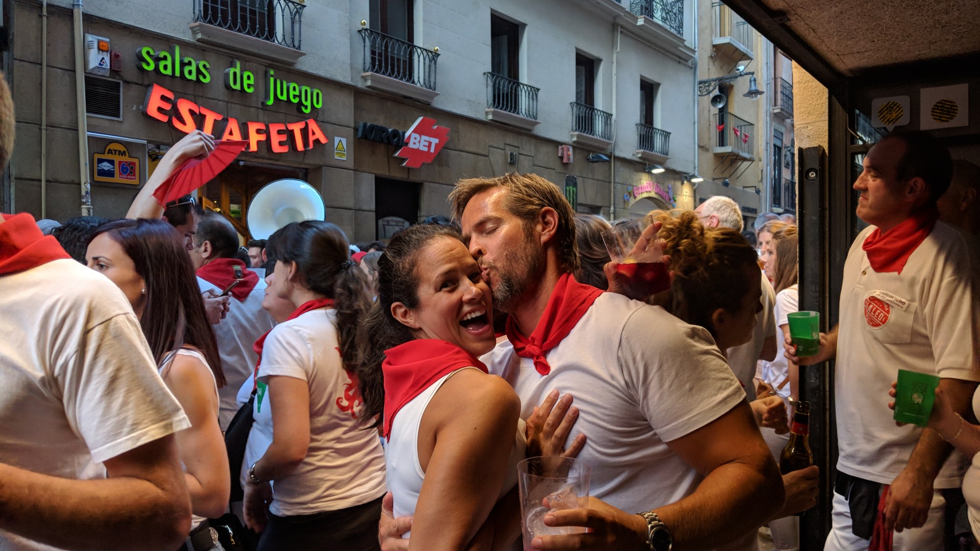 We emerged onto the Spanish streets sans kids filled with so much excitement that we knew we had to try and curtail our enthusiasm and desire to drown in a sea of sangria immediately – or tonight would be over far quicker than we anticipated (although Krys should be used to that now – it’s all about a good time, not a long time. Right?!?). But it is hard to hold back the tide of excitement that comes with parental freedom so after about 2hrs (and well before the sun was setting) we were already well on our way; the Pamplona specialty of kalimotxo (red wine and coke) will do that. After drifting between bars, bands performing in streets, and bulls, we found ourselves in the back blocks of Pamplona well after dark (which is an effort when the sun sets at 10.30pm) when a band wandered past with the biggest gathering we had seen (perhaps they were a Spanish modern day Roxette?). So we tagged onto the back and waited for them to stop. Once they did they launched into a performance that set the whole crowd (and Krys) alight. For a while there the mix of alcohol and excitement almost had Krys singing fluent Spanish.